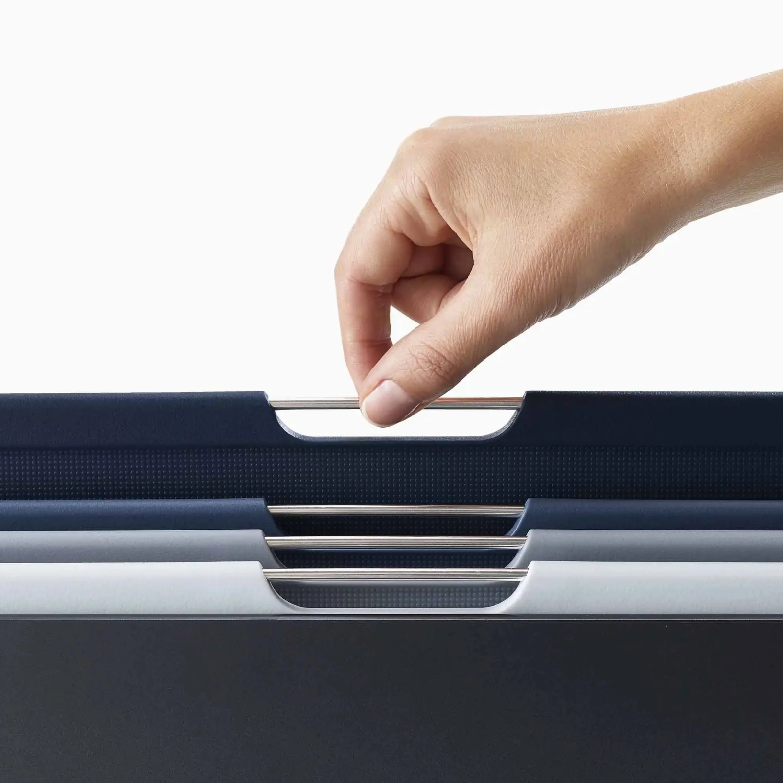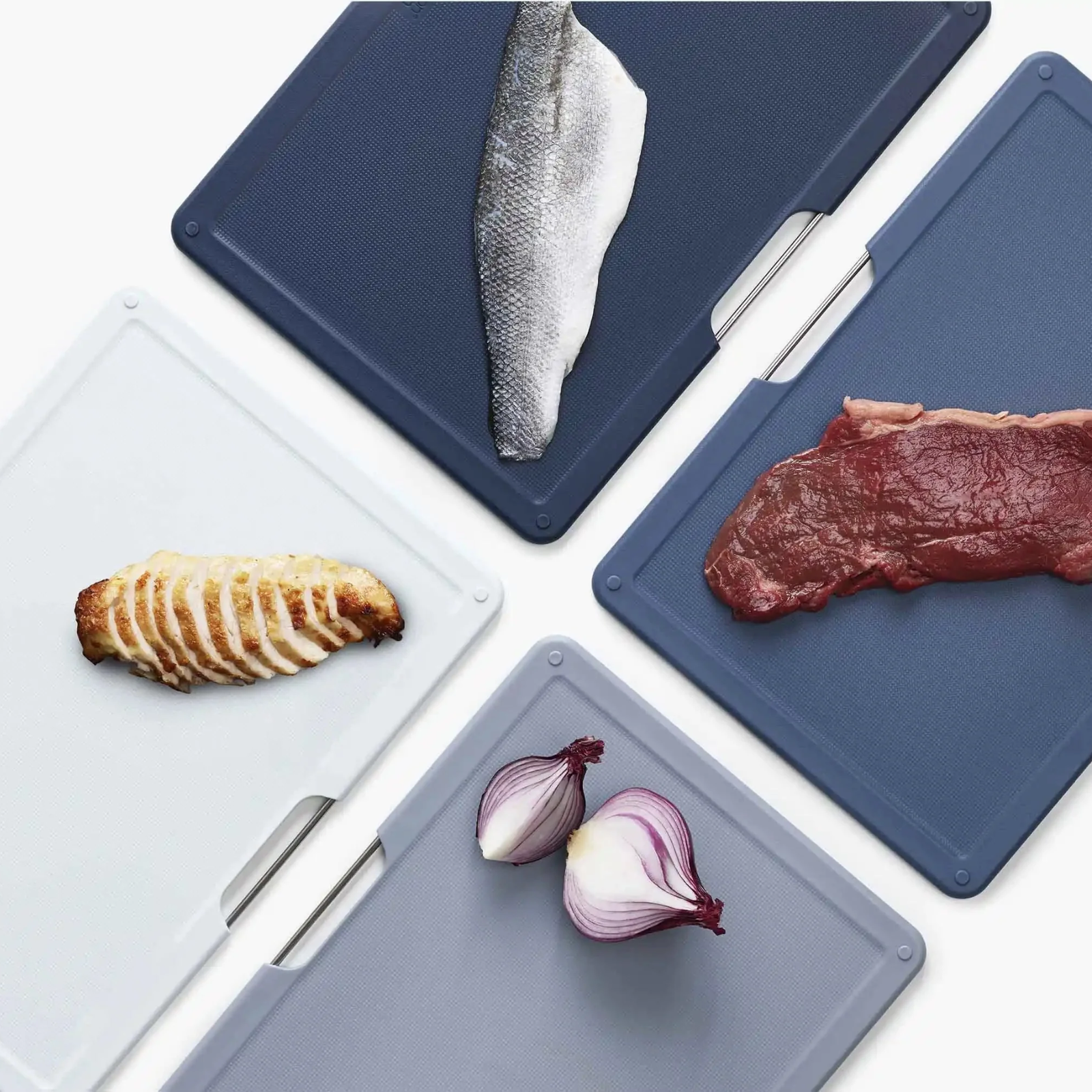 Every great meal starts with a chopping board, so we designed Folio™ to make the food-prep process more efficient and enjoyable. Our chopping board set includes four colour-coded boards with knife-friendly, textured surfaces and non-slip grip feet for safer slicing, chopping and dicing. Stainless-steel bars make it easy to select the board you need from the slim storage case.