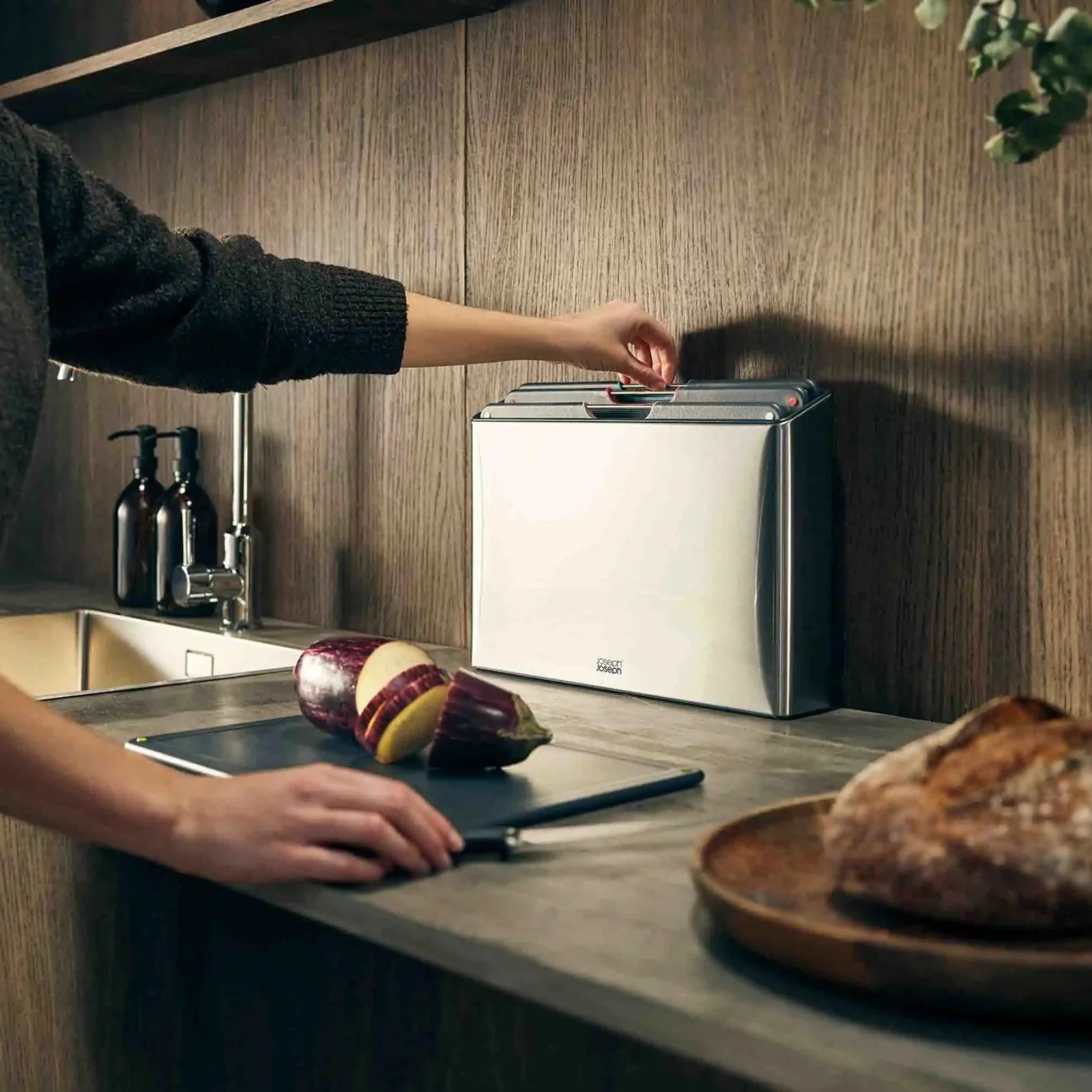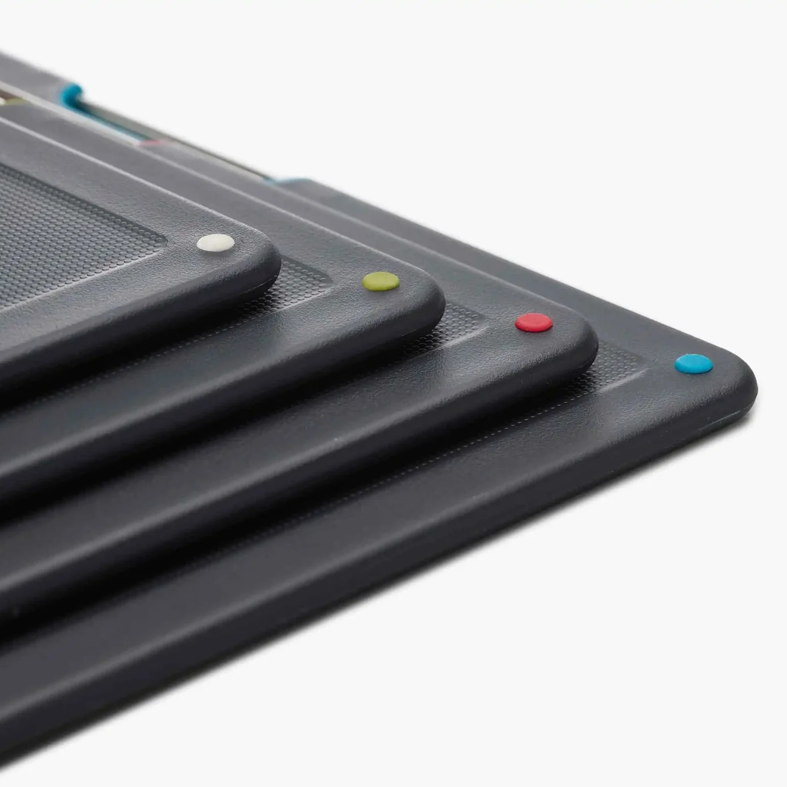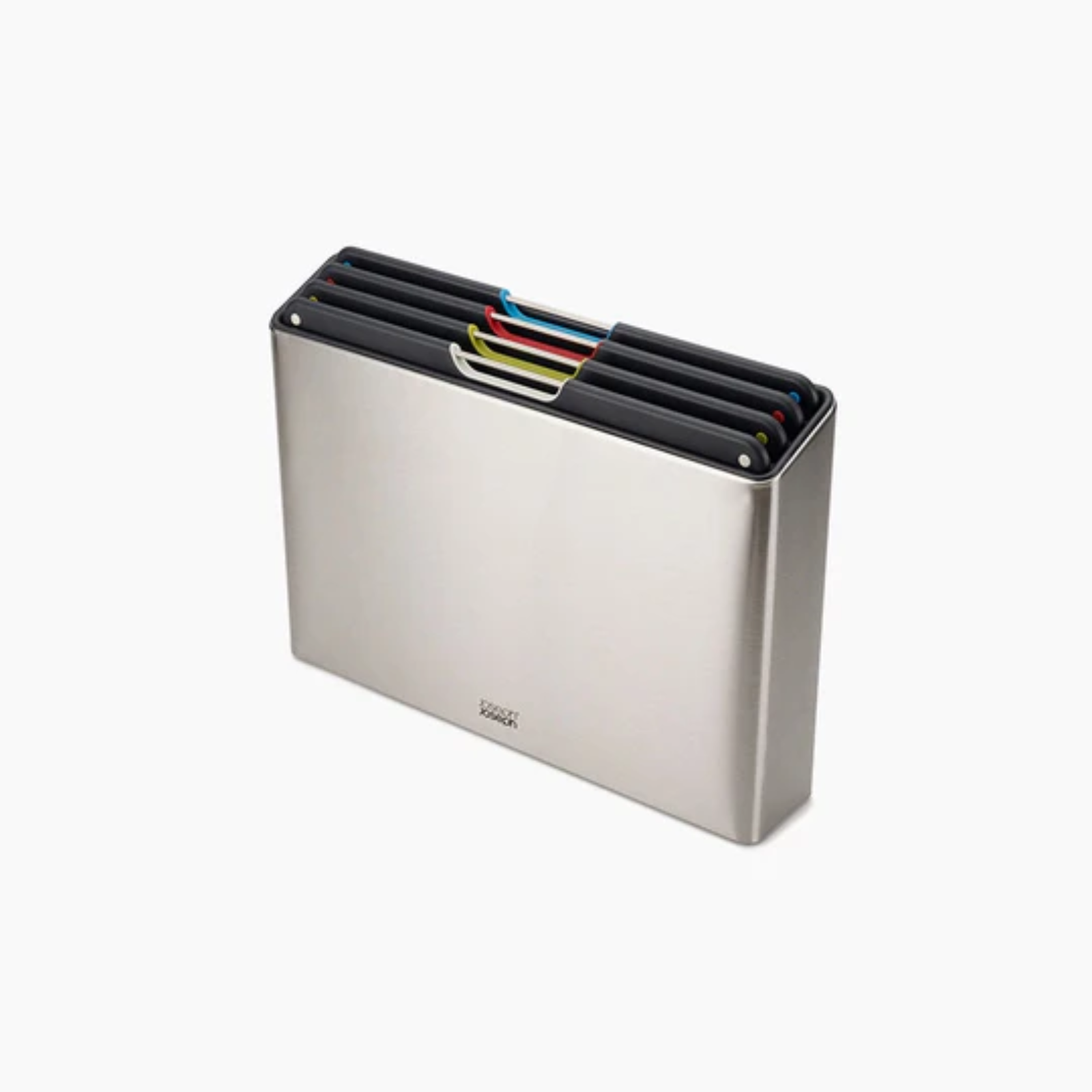 Our Folio™ Steel chopping board set is perfect for keeping all your boards organised and easy to access. Each chopping board features knife-friendly textured surfaces and colour-coded details to help make food prep more hygienic and efficient. The finishing touch? A stainless-steel case that keeps the boards neat and tidy on the worktop.