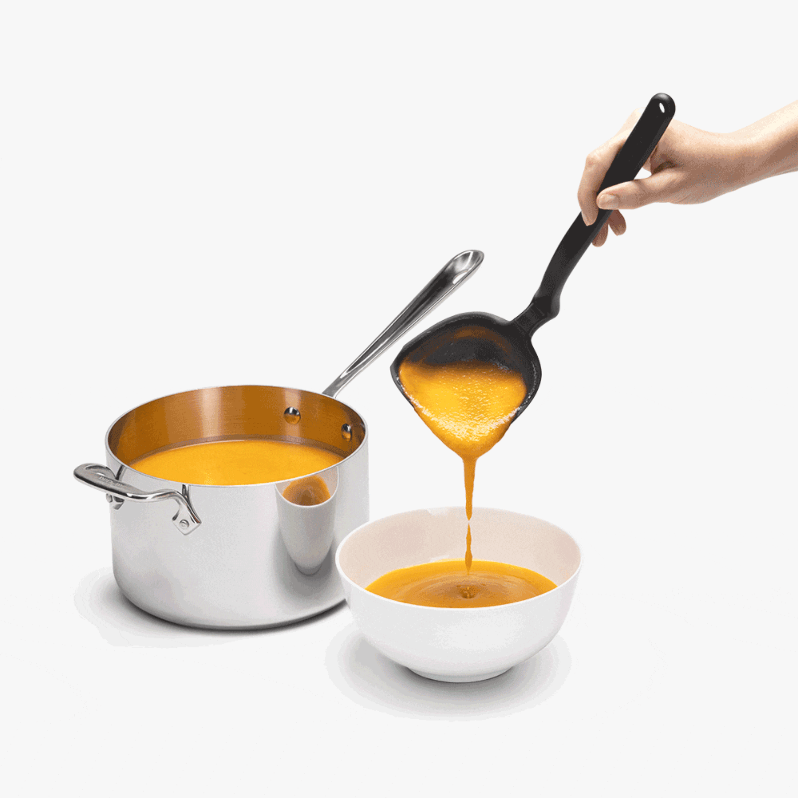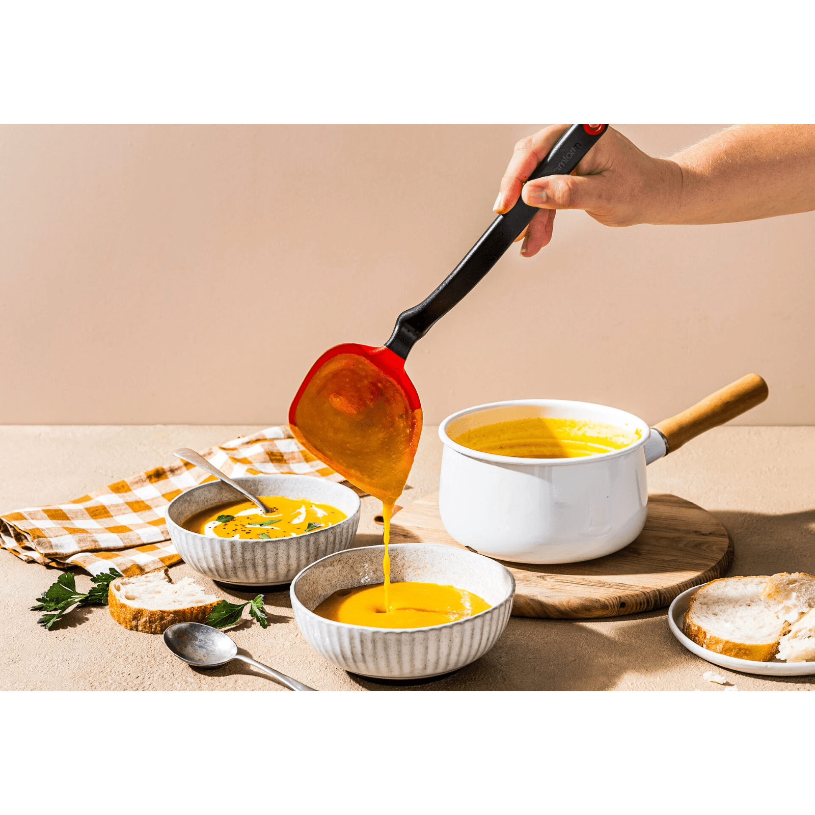Unique handle design keeps Fladle’s head up when put down or hooks to rest it on the edge of a pot, keeping countertops and benches clean.