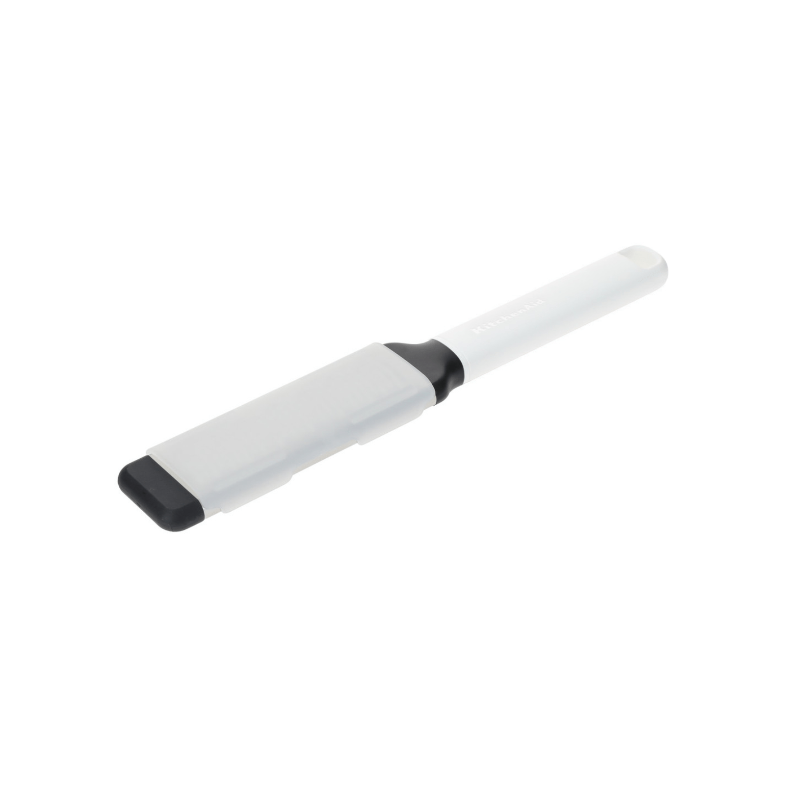 Upgrade your food prep with the KitchenAid Fine Grater, a durable and stylish tool designed for fast, efficient grating. Featuring a porcelain white handle and unique micro-serrations that grate in both directions, it's perfect for ginger, nutmeg, lemons and more. The high-quality stainless steel head delivers strength and precision, while the cushioned non-slip foot ensures stability over bowls or cutting boards. A protective blade cover keeps storage safe and simple. The handle features a debossed logo and a handy hanging loop, perfect for showcasing your kitchen utensils. Made from long-lasting materials and dishwasher safe, this versatile grater offers comfort, control, and everyday performance, an essential tool for any kitchen.