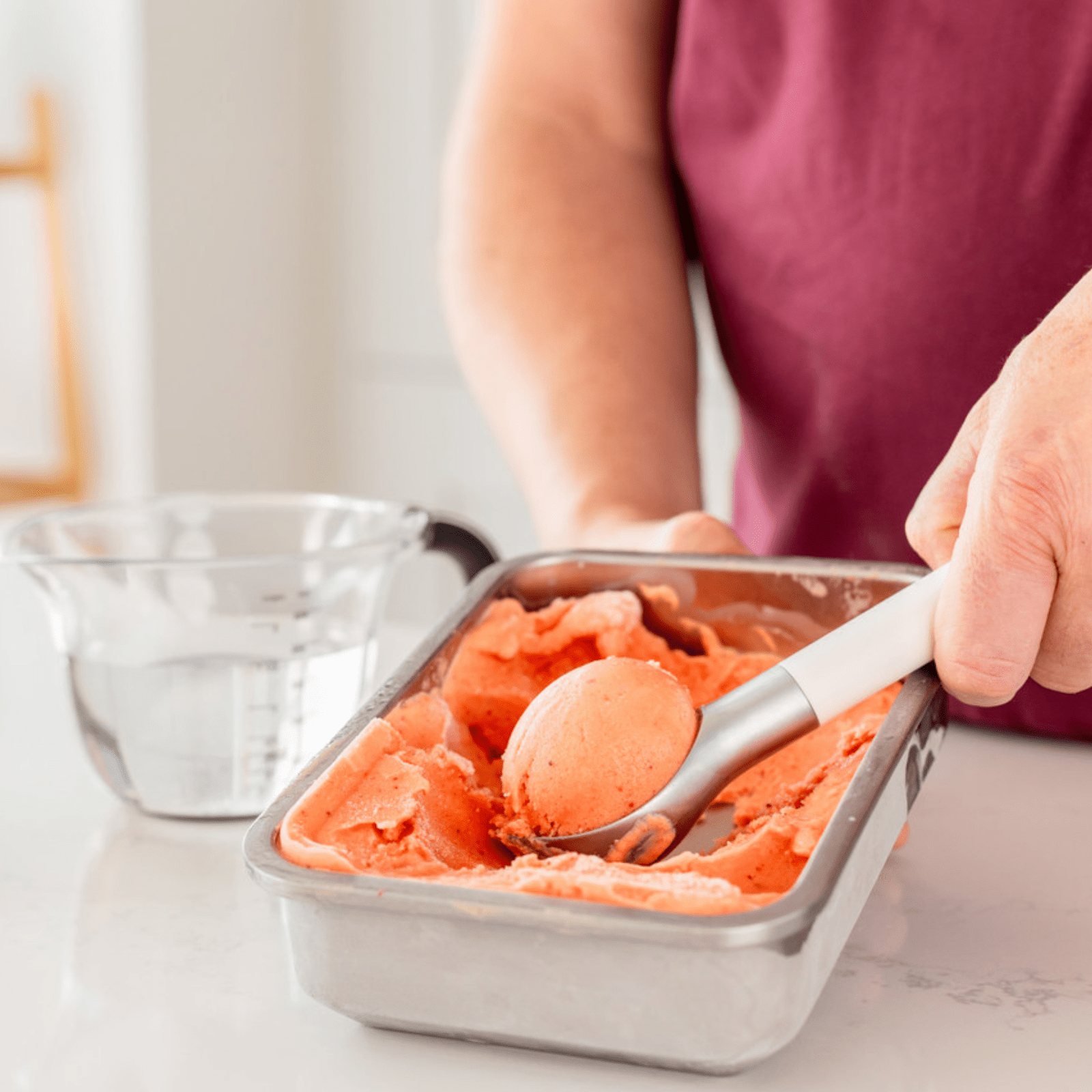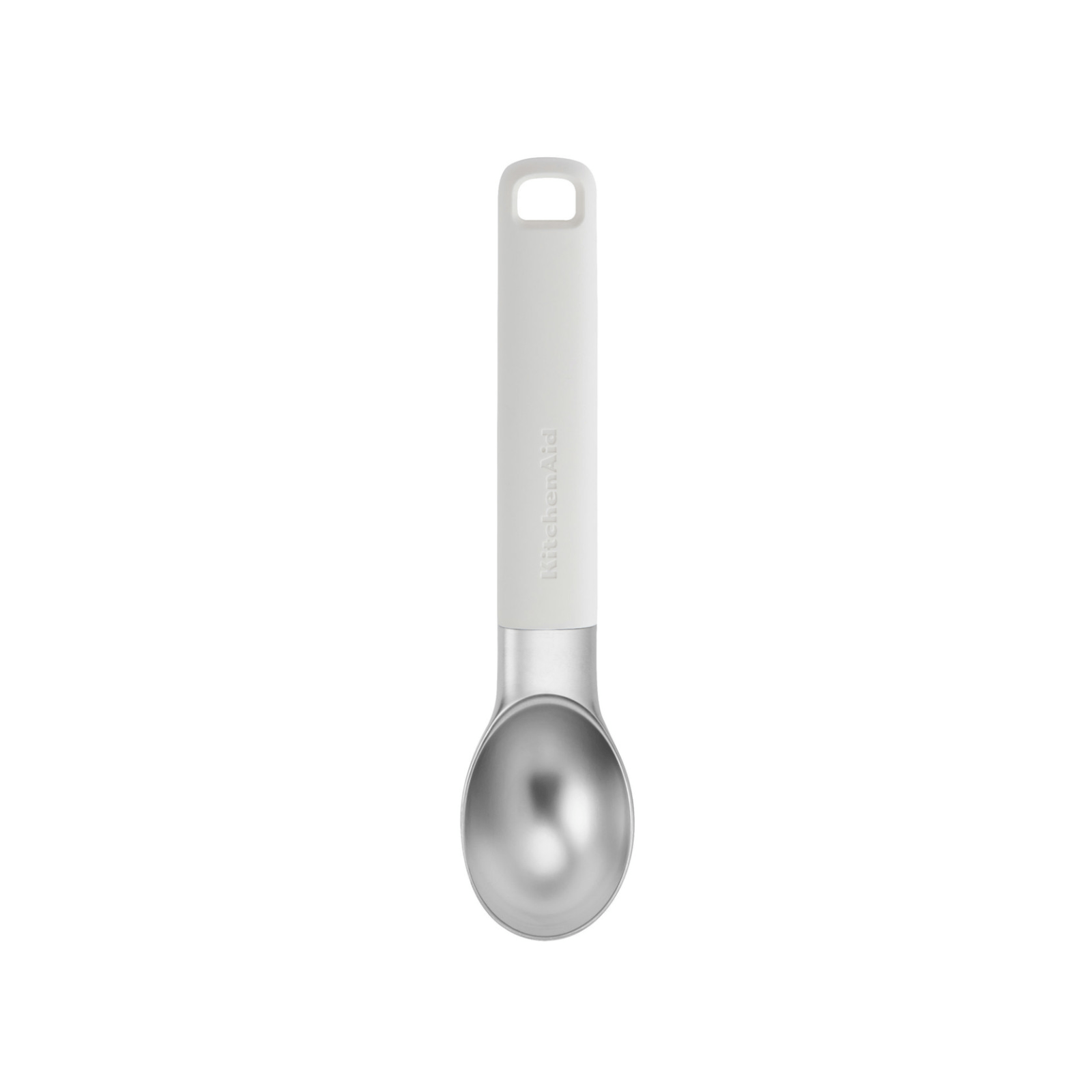Scoop ice cream, gelato, or frozen yogurt effortlessly with the KitchenAid Ice Cream Scoop. Its deep, curved head and sharp edges glide through hard frozen treats for perfect scoops every time. The ergonomic porcelain white handle is weighted for comfort and control, with a debossed logo and hanging loop. Durable and dishwasher safe, this scoop is an essential, easy-to-clean kitchen tool.