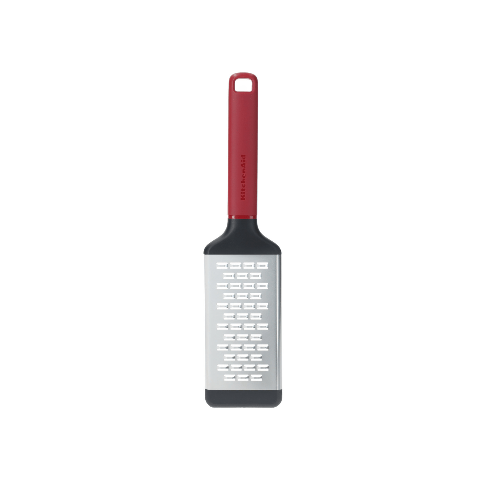 Upgrade your food prep with the KitchenAid Medium Grater, a durable and stylish tool designed for fast, efficient grating. Featuring an empire red handle and unique micro-serrations that grate in both directions, it's perfect for cheese, chocolate, vegetables, and more. The high-quality stainless steel head delivers strength and precision, while the cushioned non-slip foot ensures stability over bowls or cutting boards. A protective blade cover keeps storage safe and simple. The handle features a debossed logo and a handy hanging loop, perfect for showcasing your kitchen utensils. Made from long-lasting materials and dishwasher safe, this versatile grater offers comfort, control, and everyday performance, an essential tool for any kitchen.