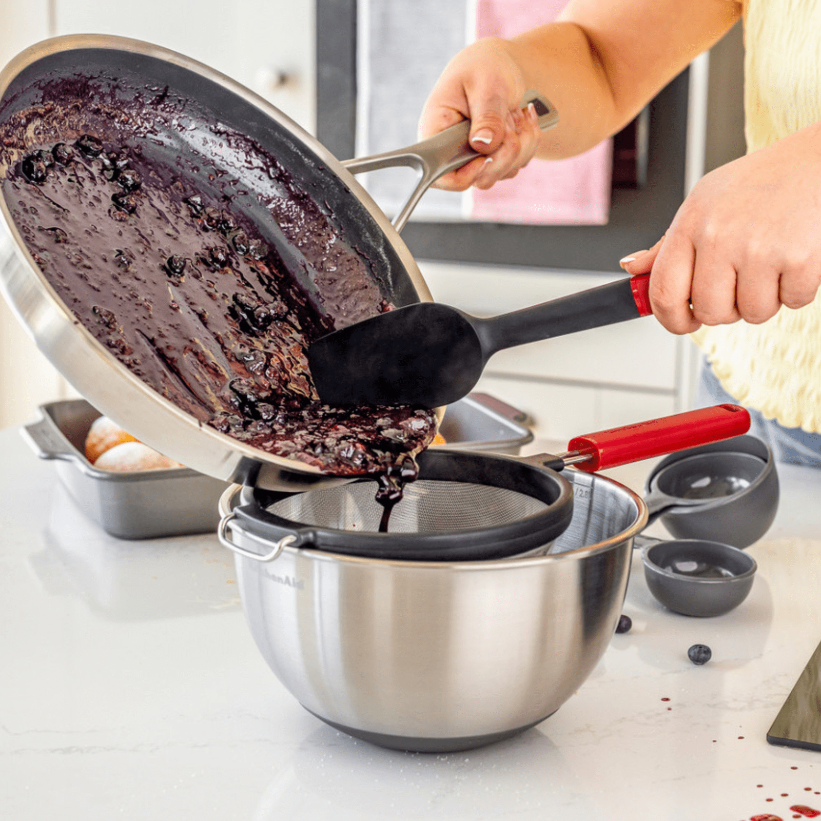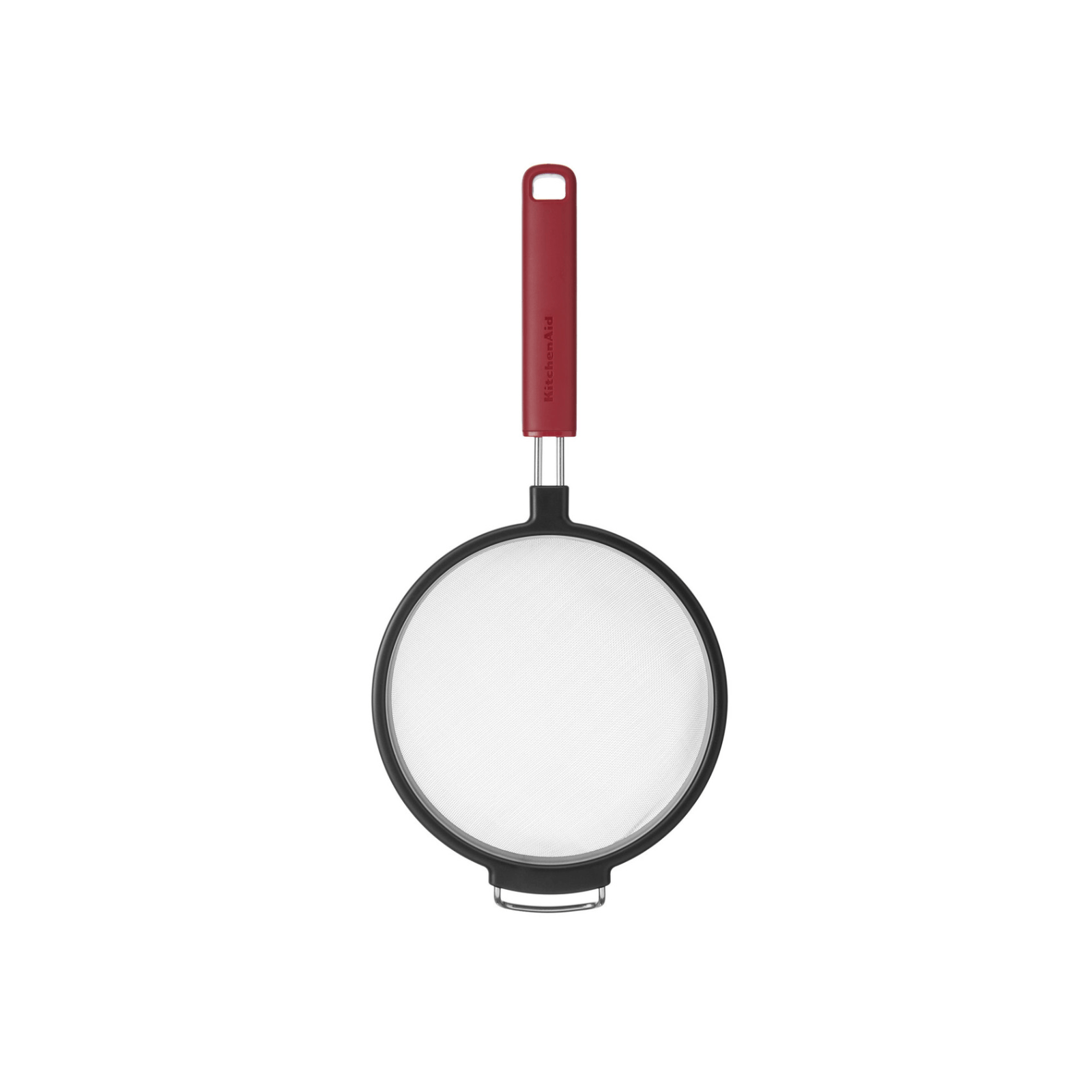 From sieving flour and sugar to straining sauces, noodles, and produce, the KitchenAid Mesh Sieve is a versatile tool for everyday prep. It's 17cm oval-shaped stainless steel mesh head handles both dry and wet ingredients with ease. The rust-resistant mesh ensures smooth straining, while the ergonomic Empire Red handle is weighted for comfort and control. The handle also features a debossed logo and a handy hanging loop, perfect for showcasing your kitchen utensils. A built-in lip and handle rest allow for hands-free use over sinks, bowls, or jars. Made from high-quality materials, this durable, dishwasher-safe KitchenAid tool delivers lasting performance, comfort, and convenience.