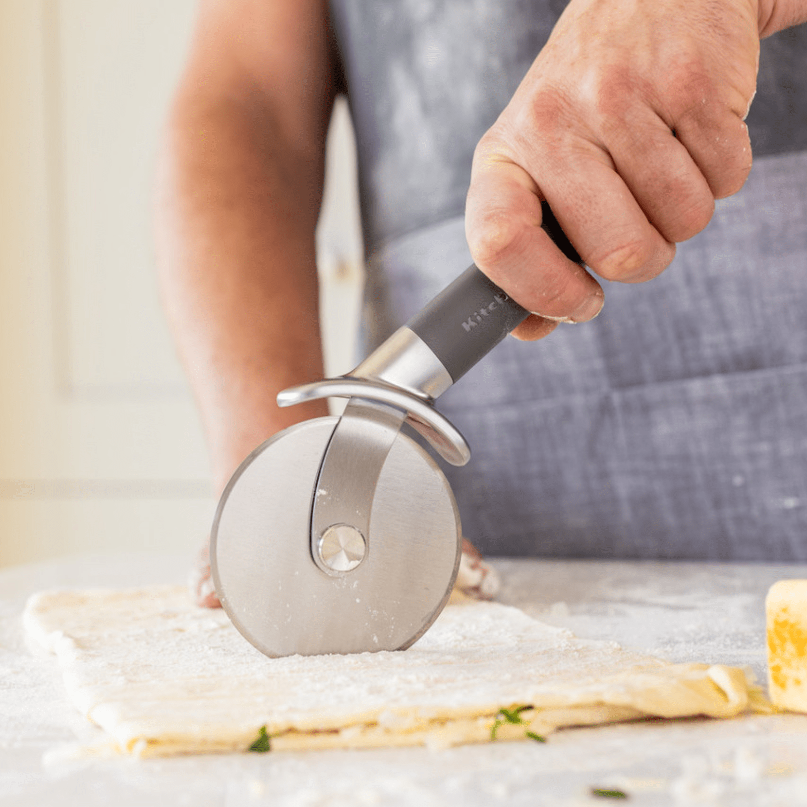 Effortlessly slice pizza, pie crust, and pastry dough with the KitchenAid Pizza Wheel, designed for precise, clean cuts every time. Its razor-sharp, angled blade makes slicing quick and easy. The wheel includes a protective finger guard for safety, while the ergonomic handle is perfectly weighted for comfort and control. Finished with a debossed logo and hanging loop, it’s easy to store with your KitchenAid tools. Made from durable materials, this dishwasher-safe pizza wheel combines functionality, durability, and comfort, an essential kitchen tool.