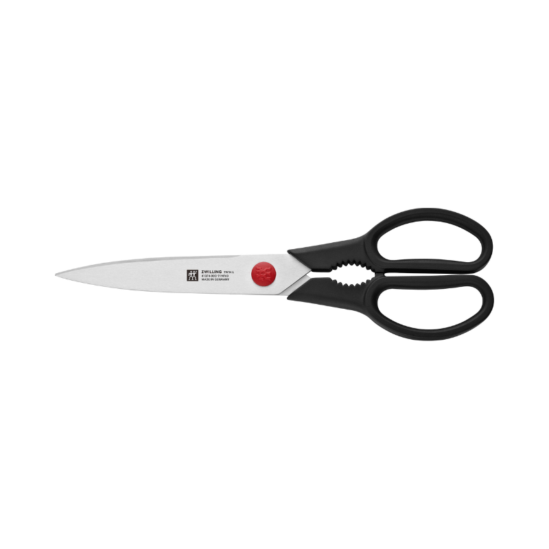 The knife block is also a sharpening stone: the self-sharpening knife block of the ZWILLING ALL*STAR series does the sharpening for you. How? With the ceramic sharpening stones in the slots of the smooth-bladed knives. They are aligned in such a way that you automatically sharpen the bevel every time you push it in and pull it out – so the kitchen knives stay nice and sharp for a long time. A special feature of the knives are their premium logo applications. You can choose for yourself which colour best suits your kitchen and lifestyle, for example, an elegant silver. As you would expect from ZWILLING, the knives impress with their sharpness and quality "made in Germany". They are made of stainless ZWILLING special formula steel and are therefore stable and corrosion-resistant. The ice-hardened FRIODUR blades impress with their edge retention and enable efficient cutting. Thanks to the newly shaped ergonomic handle made of high-quality plastic, the knives lie comfortably in the hand at all times. For fatigue-free work with any cutting technique. The self-sharpening knife block contains a paring knife, a utility knife, a bread knife, a chef's knife and a carving knife. In addition to the knives, the grey knife block is equipped with a pair of ZWILLING TWIN L multi-purpose scissors, a real all-rounder for your kitchen. Please note: The self-sharpening knife block is only suitable for these kitchen knives from the ZWILLING ALL*STAR series.