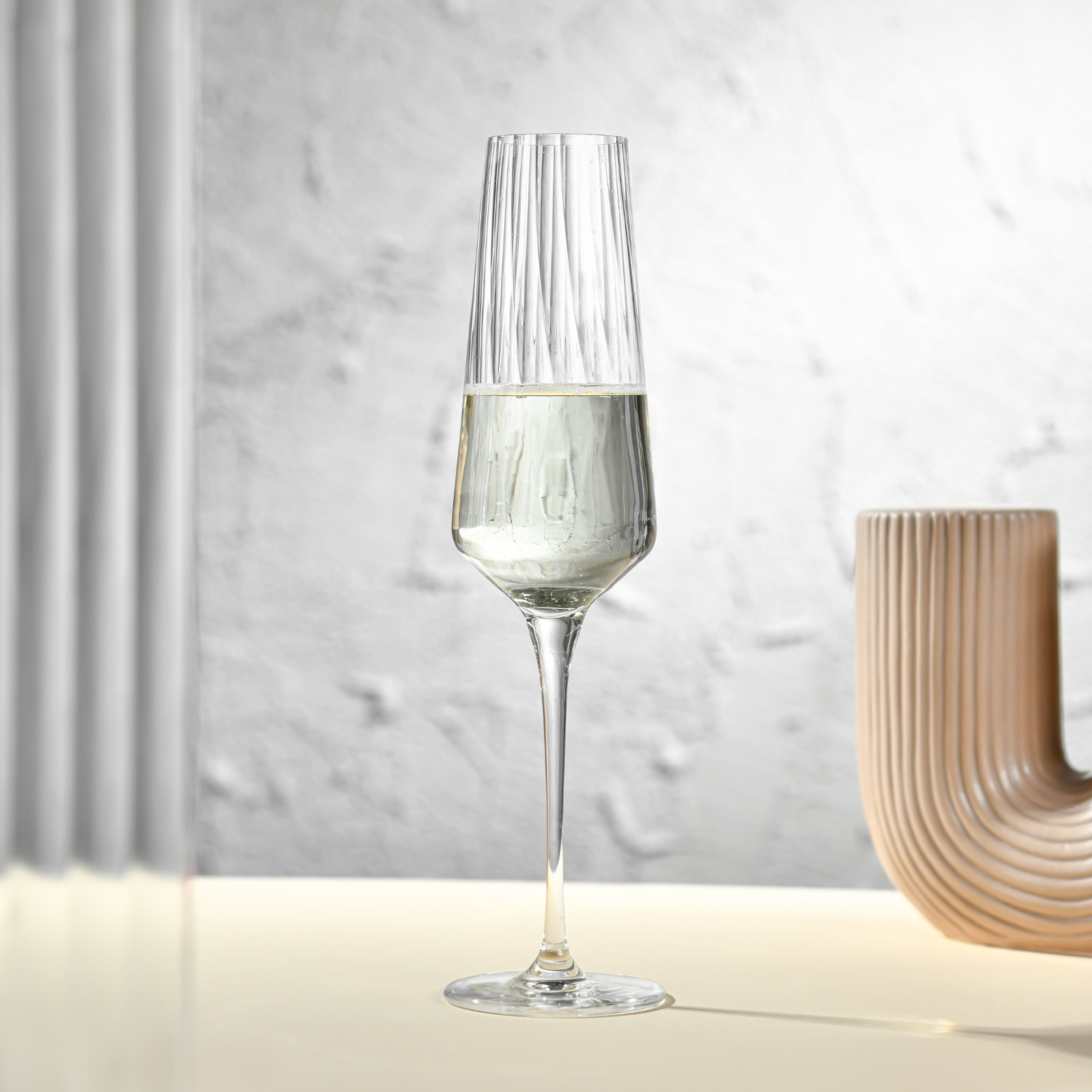 This set of six champagne flutes brings refined sparkle to every toast. Made from lead-free Crystalline glass, each flute features sleek contours and brilliant clarity that capture the light in captivating ways. Perfect for sparkling wine and celebratory moments, they add a touch of modern elegance to any occasion.