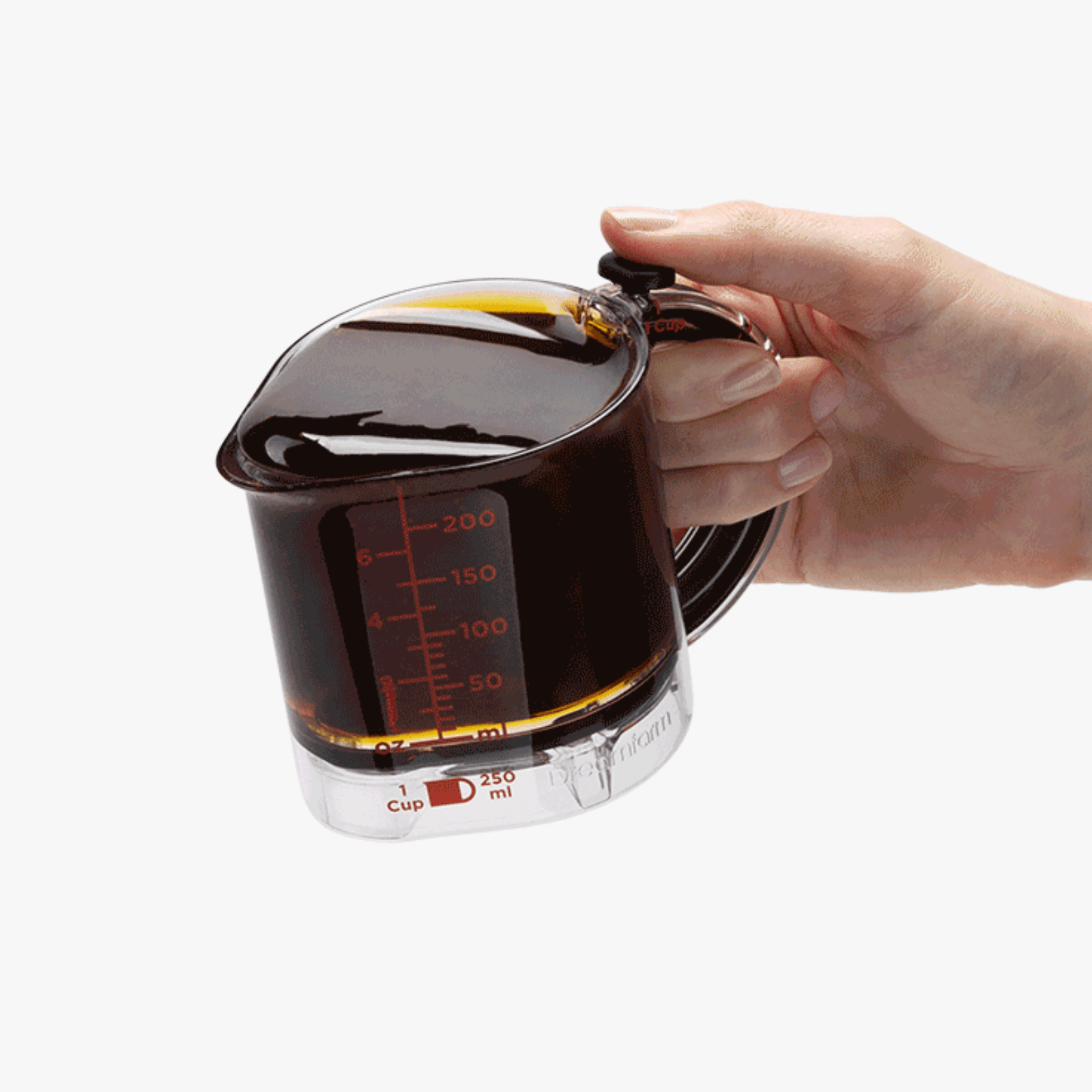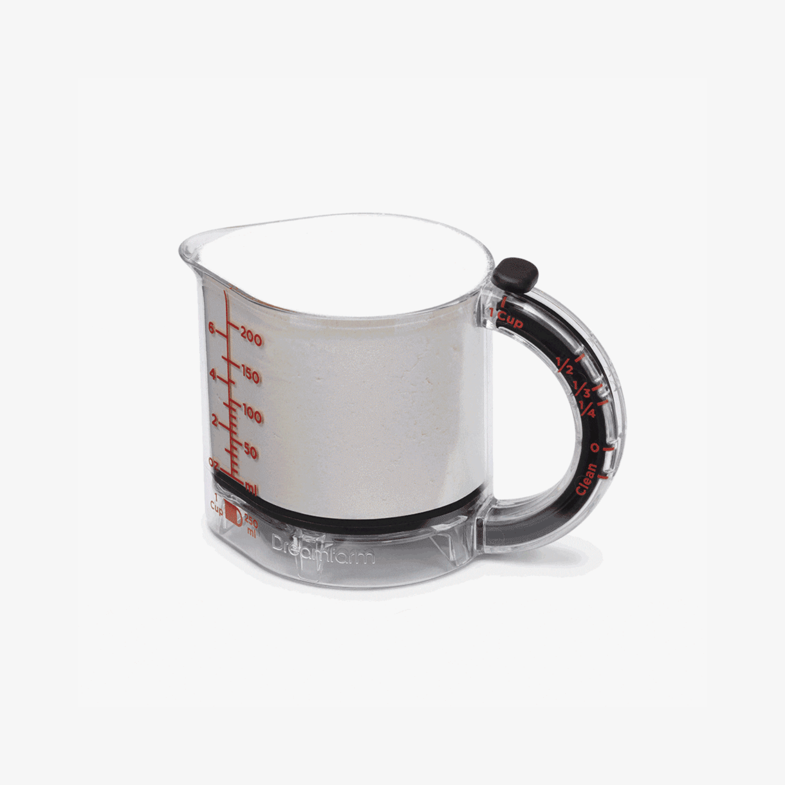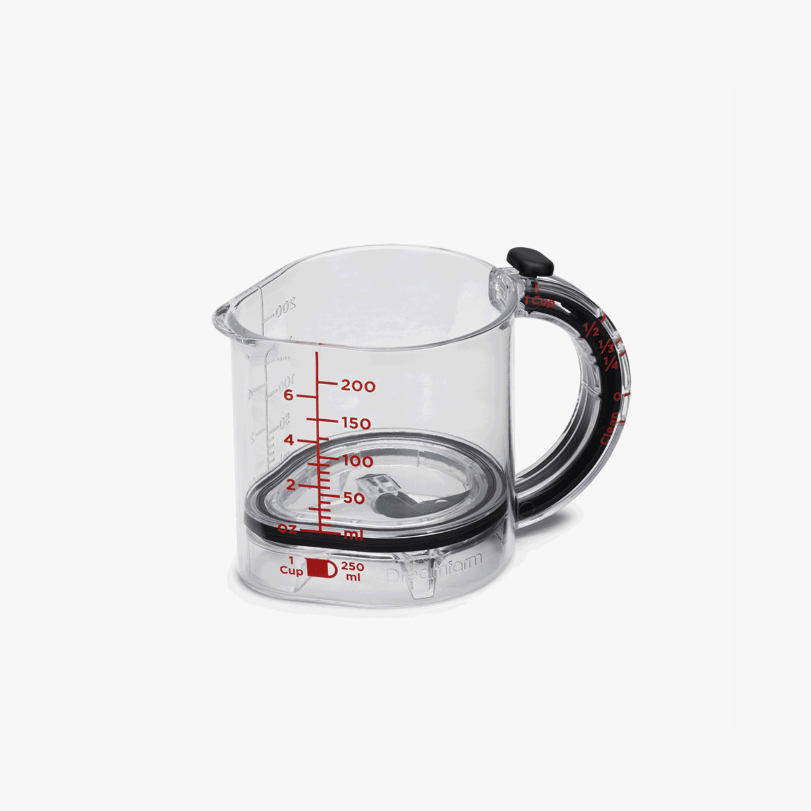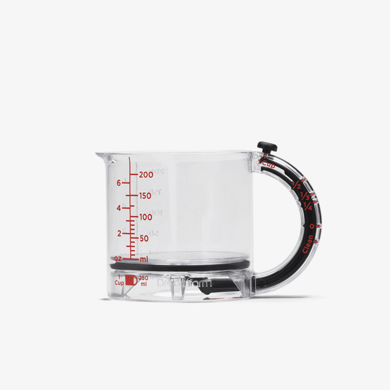 Upcup’s adjustable base raises to create 1 cup, ½ cup, ⅓ cup, and ¼ cup measuring cups, all in a single cup.