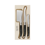 Verdier 3-Piece Cheese Knife Set, made in Laguiole, France by Andre Verdier. This set includes three essential tools for serving and enjoying cheese, each made of stainless steel blades and resin handles, complete with the iconic Laguiole Bee.