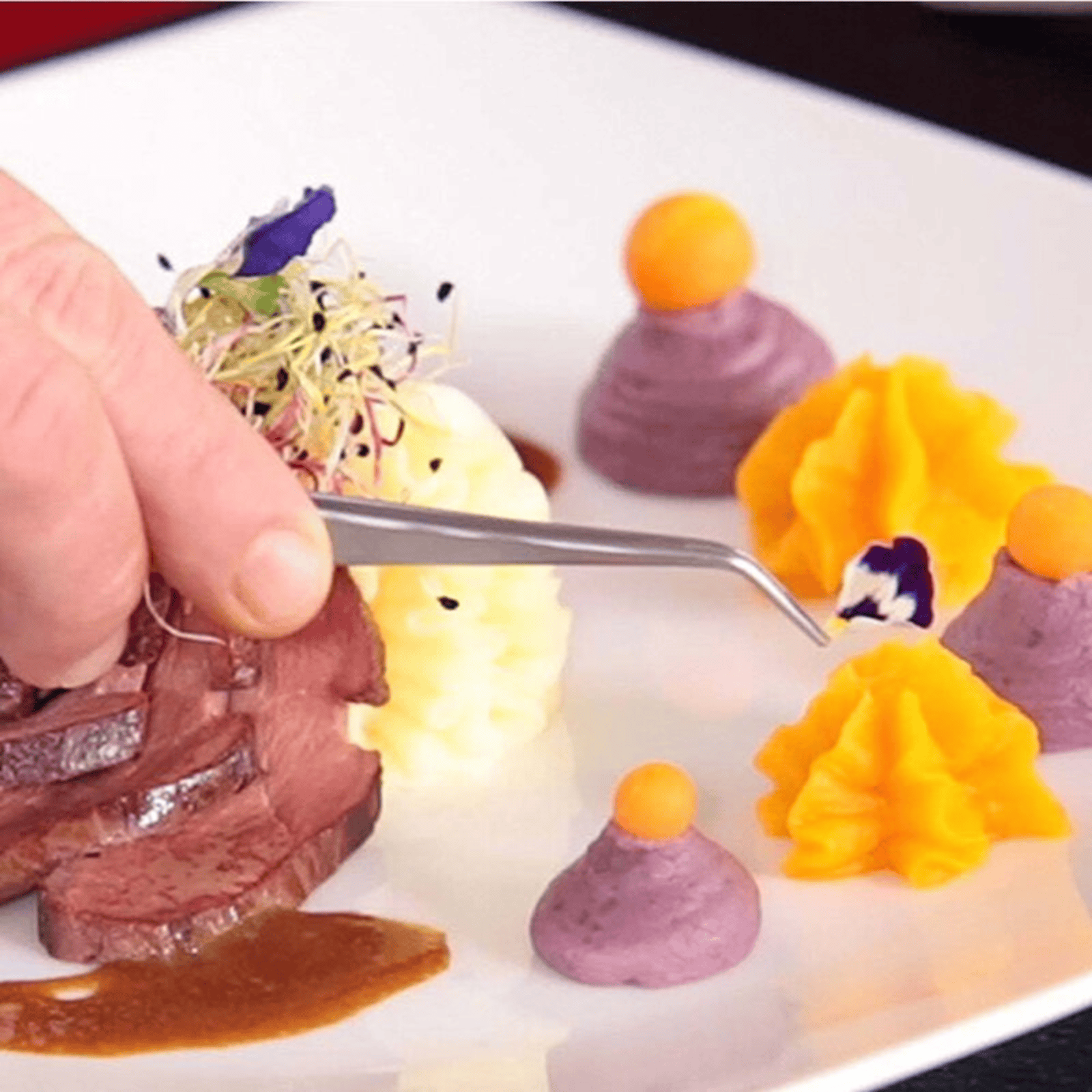 De Buyer's 30cm stainless steel curved end tweezers are precision kitchen tools ideal for delicate food handling. Crafted from high-quality stainless steel, their curved design ensures a secure grip and precise control when plating or handling intricate dishes. These tweezers are a versatile choice for professional and home chefs alike.