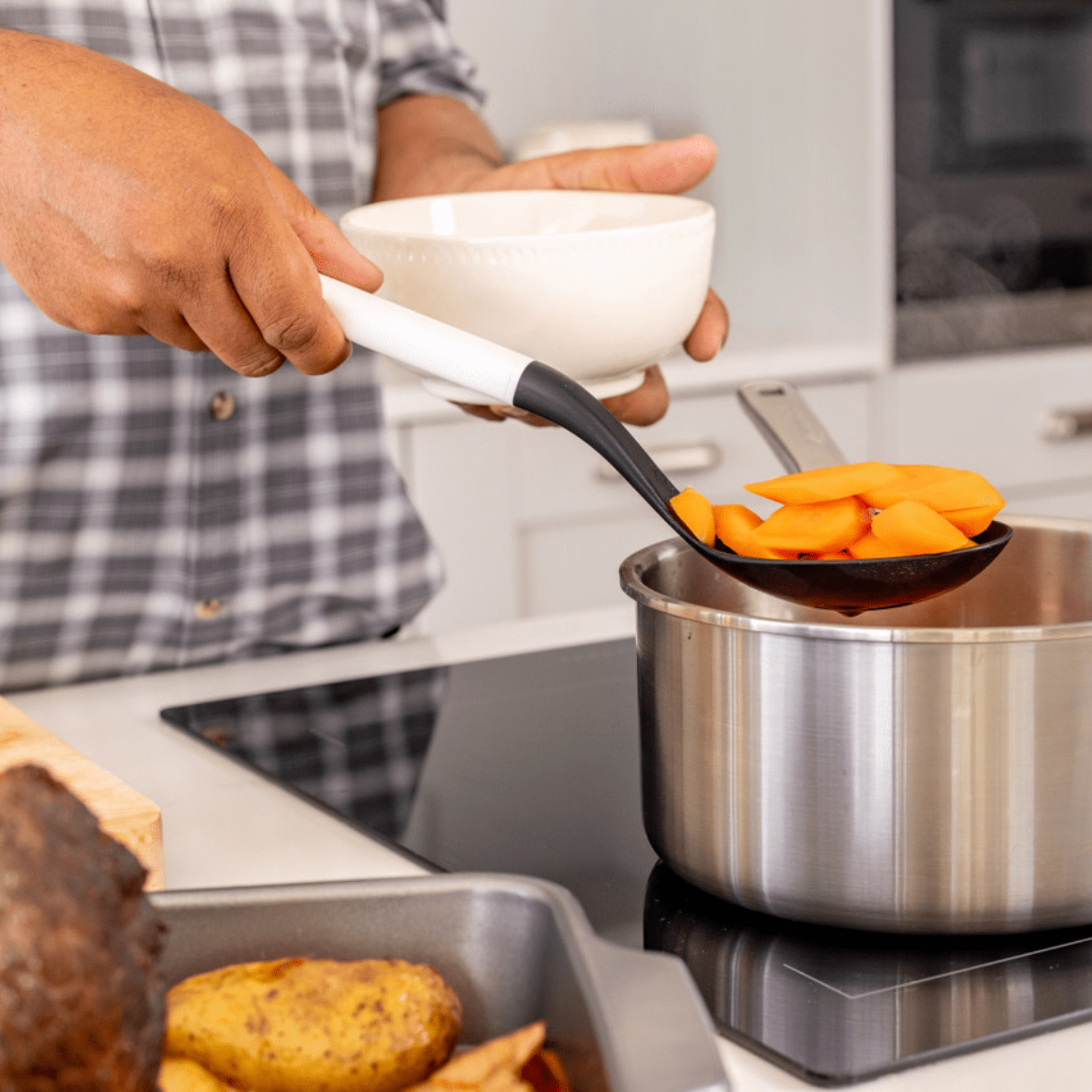 The KitchenAid Slotted Spoon is a durable, stylish tool for everyday cooking and serving. At 34cm with a smooth porcelain white handle, it features an oversized slotted bowl for efficiently draining liquids, perfect for pasta, veggies, and fried foods. The heat-resistant nylon head (up to 232°C/450°F) is safe for all cookware, including non-stick. Its ergonomic, well-balanced handle offers comfort and control, with a debossed logo and hanging loop for added convenience.
