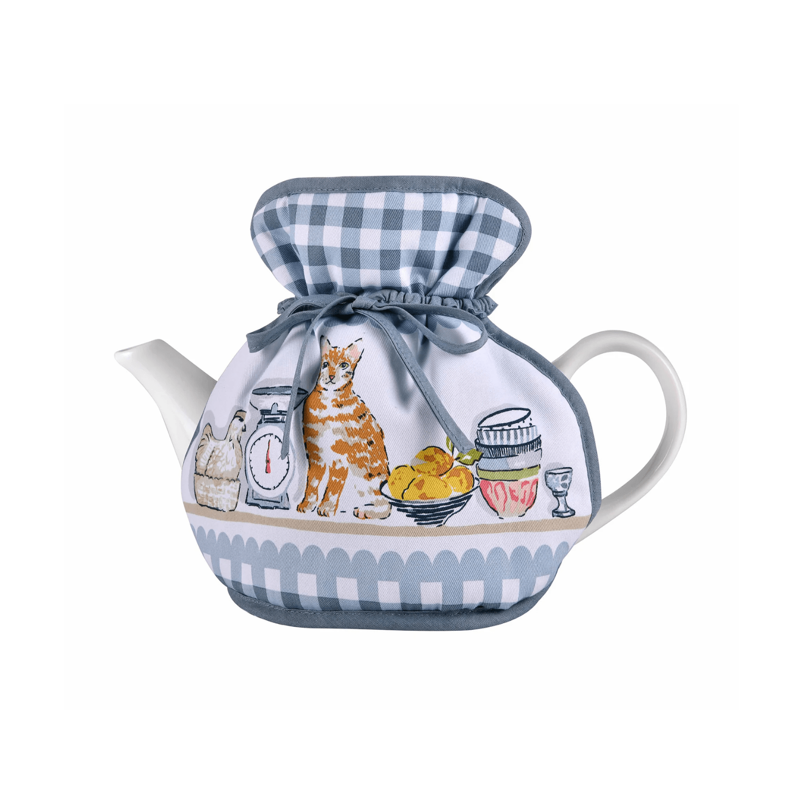 Inspired by a traditional cottage pantry, this design showcases shelves lined with cooking utensils, cookbooks, ceramics, and quirky finds. Playfully incorporating the mischievous nature of cats weaving around countertops, it is hand-painted using watercolours and pen. Gingham and floral borders complete the look, evoking a charming cottagecore aesthetic.
