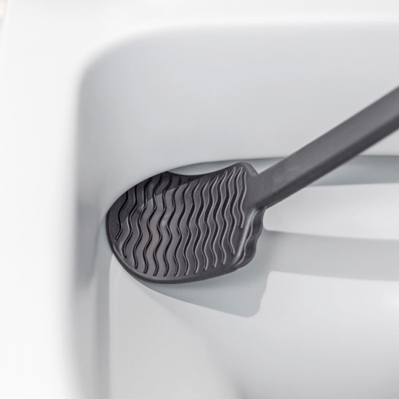 Its flexible rubber spatula easily reaches every corner of the toilet, even under the edge and siphon.