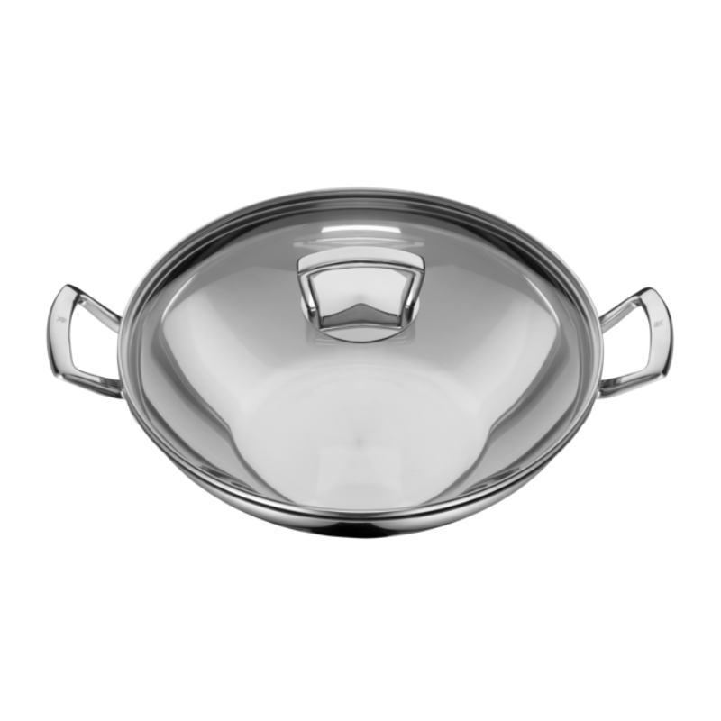 Crafted from noble glass, the elegant see-through lid with stainless steel handle ensures easy monitoring while cooking.