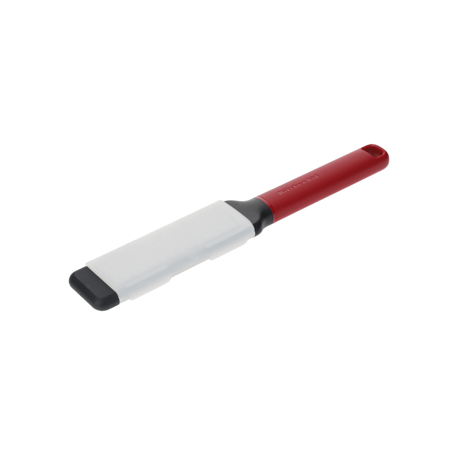 Upgrade your food prep with the KitchenAid Fine Grater, a durable and stylish tool designed for fast, efficient grating. Featuring an empire red handle and unique micro-serrations that grate in both directions, it's perfect for ginger, nutmeg, lemons and more. The high-quality stainless steel head delivers strength and precision, while the cushioned non-slip foot ensures stability over bowls or cutting boards. A protective blade cover keeps storage safe and simple. The handle features a debossed logo and a handy hanging loop, perfect for showcasing your kitchen utensils. Made from long-lasting materials and dishwasher safe, this versatile grater offers comfort, control, and everyday performance, an essential tool for any kitchen.