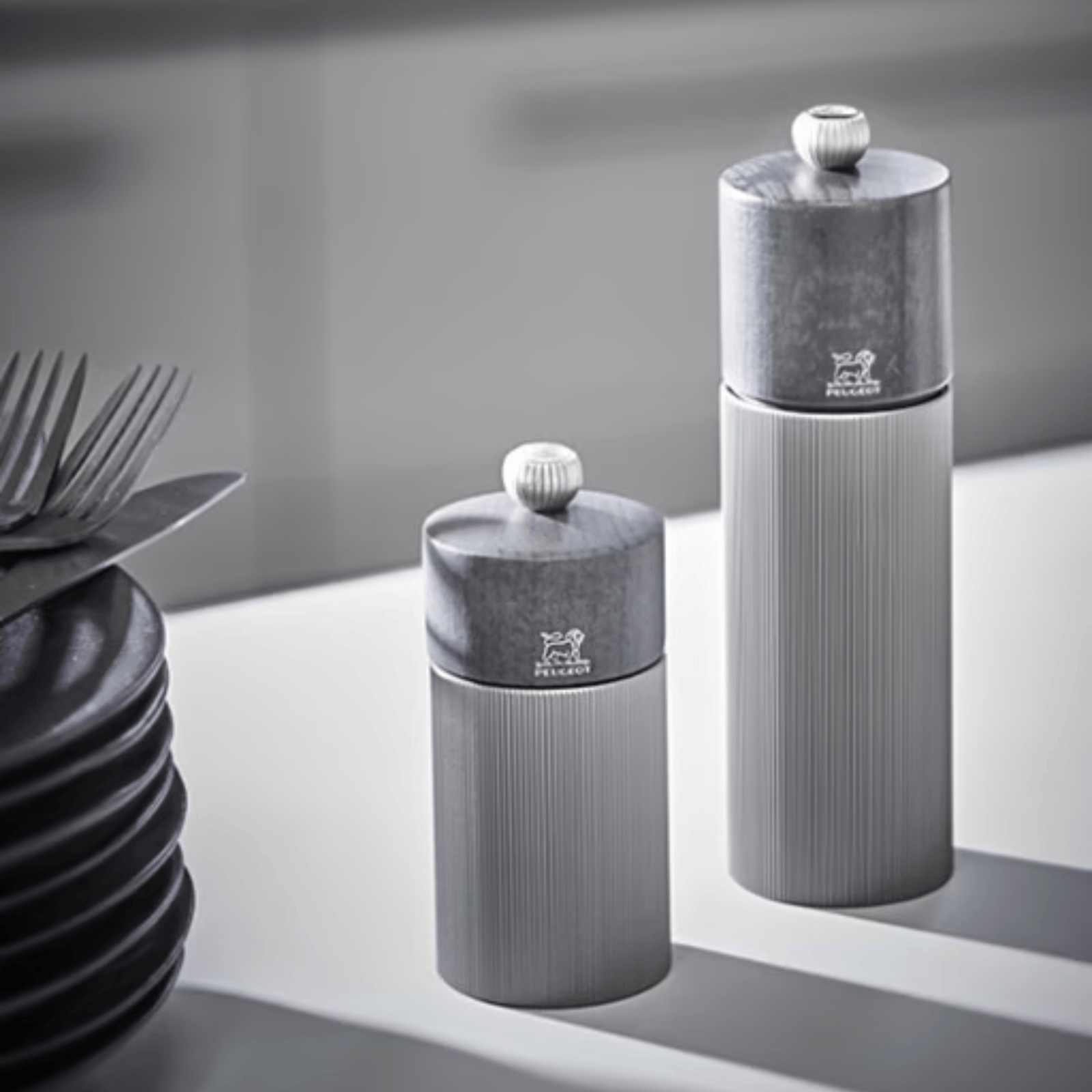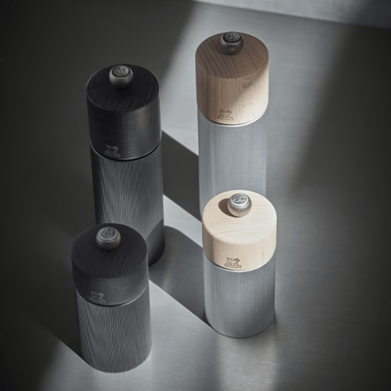 This Carbon Line manual salt mill from Peugeot flawlessly combines natural wood in a graphite finish and strong aluminium. The shiny metal button adorned with the Peugeot lion head is used to adjust the salt grind setting. The more the button is screwed, the finer the grind. This salt mill can be paired with the Carbon Line pepper mill to create a two-tone salt and pepper set.